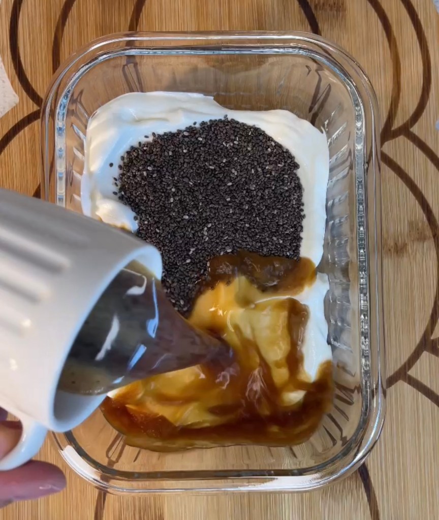 1. In a sealable jar or container, stir together the Greek yogurt, oats, chia seeds, maple syrup, and espresso until fully combined.