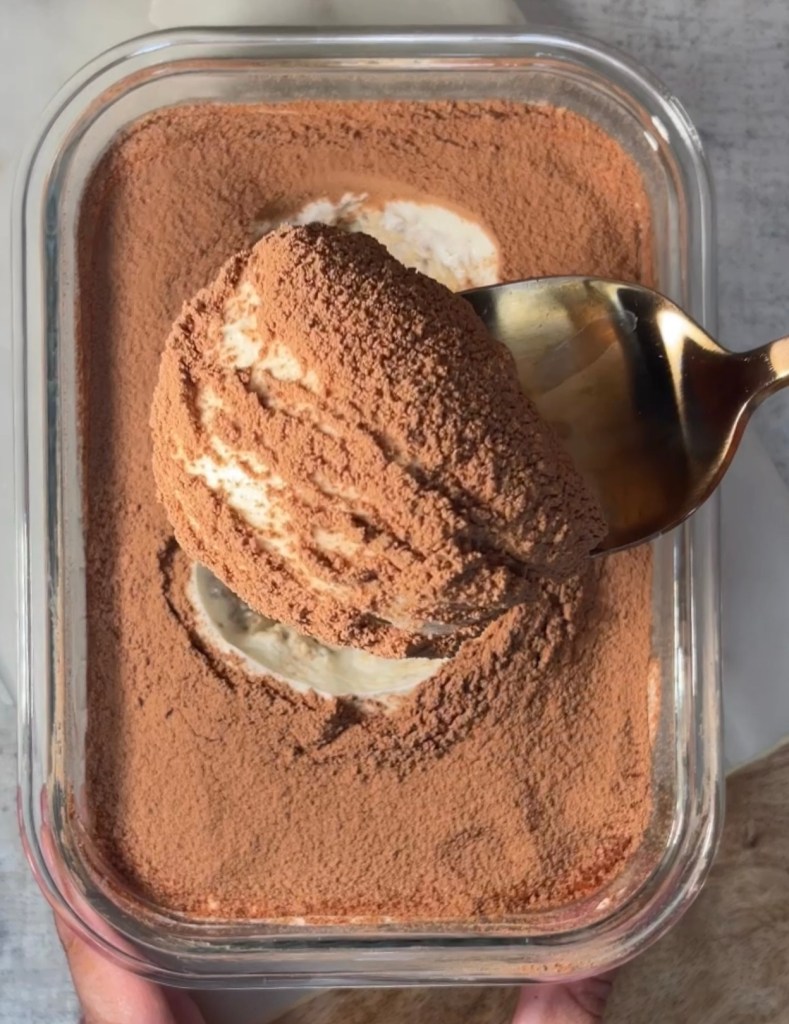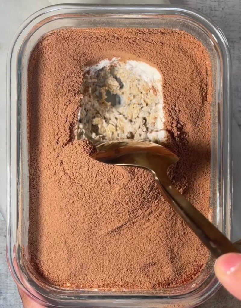 3. Next morning: smooth over a thin layer of Greek yogurt, then dust with cacao powder for that tiramisu look.