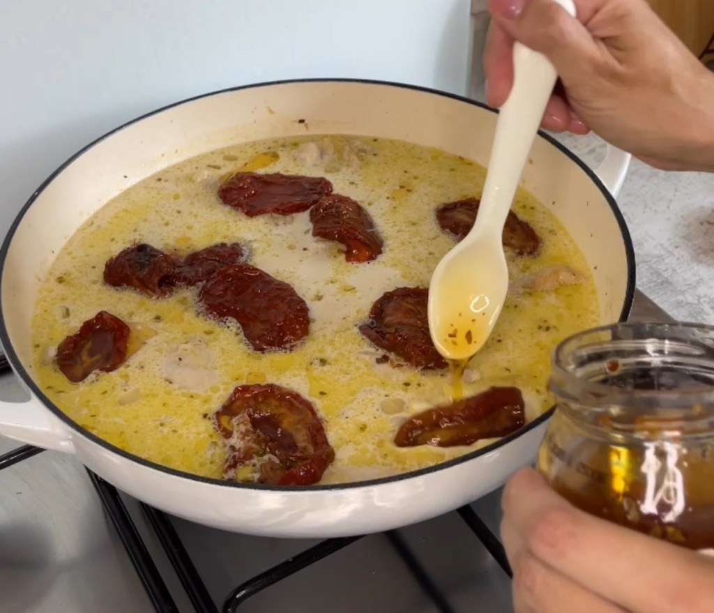 4 chicken breasts (or thighs if you prefer) 2 tbsp olive oil 3 cloves garlic, minced 1 onion, finely chopped 250g orzo pasta 500ml chicken stock 200ml double cream 50g sun-dried tomatoes, chopped 1 tsp paprika 1 tsp dried oregano ½ tsp chilli flakes (optional) 60g parmesan, grated Fresh basil to garnish Salt & pepper to taste